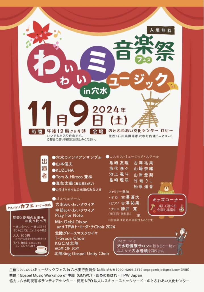 穴水町、2024年11月9日 – 令和6年能登半島地震で被害にあわれた穴水町の皆様の力になりたいとゴスペルシンガーたちが思いを募らせ企画した「わいわいミュージックフェス in 穴水」が「のとふれあい文化センター(石川県鳳珠郡穴水町)」で開催されます。
