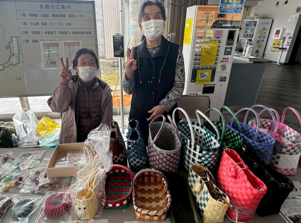 特に人気なのは、PPバンドでつくるバッグ。様々な模様を入れた個性豊かな作品が揃っています。今では住民のかたが中心の「よらんかいね」というサークルで作品をつくり、販売もはじめました。売上金はサークル仲間のお茶会などの資金になっているそうです。