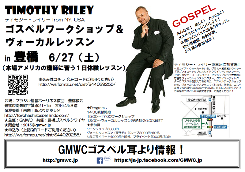 ★Program: 6/27(土) 14:30受付開始 15:00〜17:00ワークショップ 18:00〜ヴォーカルレッスン(予約制) 20:00頃終了 ★参加費 ワークショップ3000円 ヴォーカルレッスン(要予約) グループ(4〜10人/60分)2000円/人、 セミプライベート(2〜3人/45分)4000円/人、 プライベート(1人/30分)5000円/ ★Place:ブラジル福音ホーリネス教団 豊橋教会 豊橋市南栄町字蟹原21-15 大羽ビル3階 渥美線「南栄」駅より徒歩5分 豊橋ゴスペルクワイヤHP ※駐車場はありません。公共交通機関をご利用ください。 ![]() ★曲:課題曲はこちら (進度に応じて2〜3曲取り組みます) ★持ち物:筆記具、ペットボトルや水筒などフタ付の飲み水、 スマホやレコーダーなど録音できるもの(復習用)など ★主催:GMWC 共催:豊橋ゴスペルクワイヤ ★問合せ:GMWC事務局 ★申込み 申込みフォーム ※席に限りがあります。お申し込みはお早めに! |