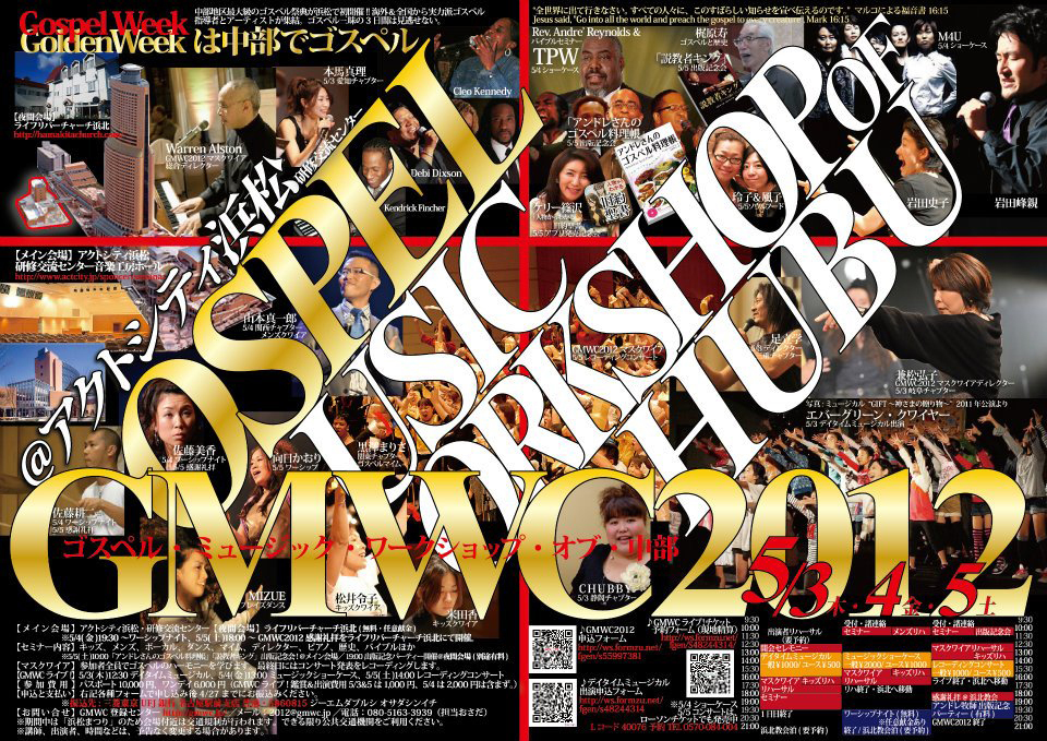ゴスペルに出会った喜び、もたらされた恵みとともに、賛美しよう、礼拝しよう!!牧師によるメッセージがあります とき:5/4 19:30〜21:00 ワーシップナイト 5/5 18:00〜19:00感謝礼拝 会場:浜北リバーチャーチ MAP 交通:浜松駅より遠州鉄道 芝本駅下車 徒歩約5分 入場料:無料 *席上献金あり(任意。お気持ちのある方はご協力ください。) ※ワークショップに参加していない方もお入りいただけます。ご家族、お友達を誘ってご来場ください。 | |