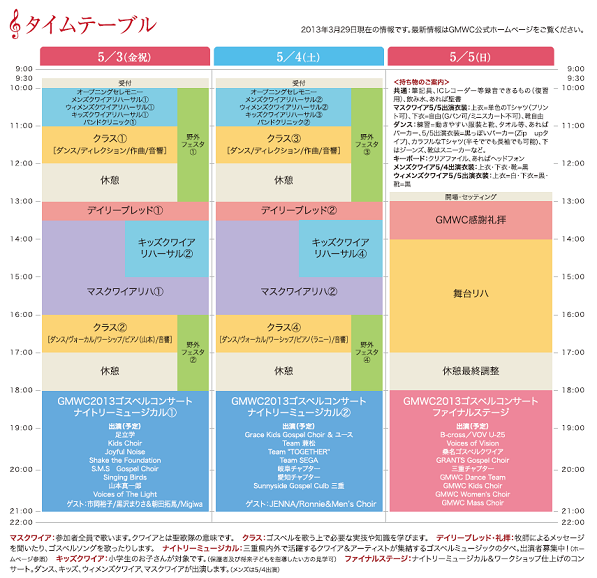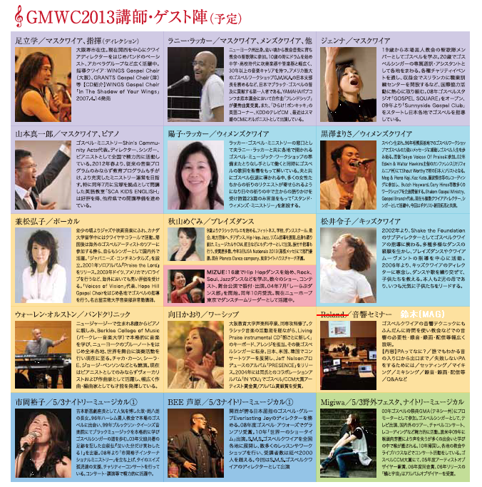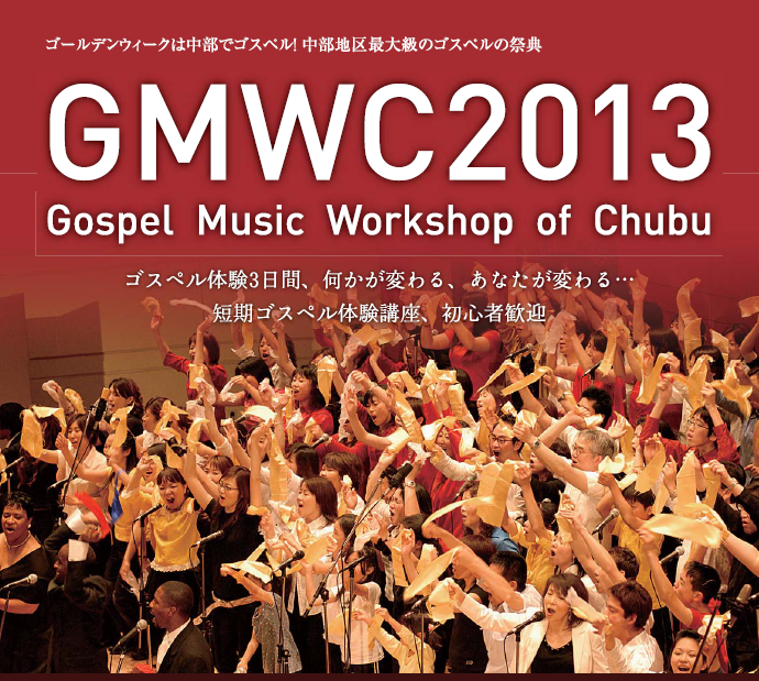 5/3-5 18:00- 三重県内外のゴスペラーが大集合、毎日違うゲストアーチストも楽しみ! 《出演予定》 5/3 ナイトリーミュージカル@ ゲスト:市岡裕子、黒澤まりさ&朝田拓馬、Migiwa 出演:BEE芦原&SMSゴスペルクワイア、山本真一郎、足立学、キッズクワイア、ジョイフルノイズ、Shake the Foundation岡崎、Singing Birds、Voices of the Light 5/4 ナイトリーミュージカルA ゲスト:JENNA、Ronnie & GMWC Men's Choir 出演:Grace Kids Gospel Choir & ユース、Team兼松、Team"Together"、Team SEGA、岐阜チャプター、愛知チャプター、Sunnyside Gospel Club三重 5/5 ファイナルステージ GMWC2013の集大成、マスクワイア、ダンス、キッズ、ウィメンズクワイア、三重チャプター、グランツゴスペルクワイア、桑名ゴスペルクワイア、Voices of Visio、 VOV U-25、B-cross | 5/3-4野外フェスタ実施! |
